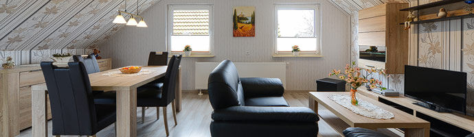 Wohnecke mit Couch, Sessel, Hockertisch, Fernseher, Sat- TV, DVD Player, Telefon, Essplatz mit Tisch & 4 Stühlen, Sideboard
